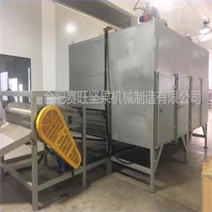 五香瓜子自动复烤机是通过已经预热好的导热油(重油)或天然气燃烧的火热通过上下层钢管式散热器的辐射方式营造复烤机体内的高温氛围,从而对烘箱物料(如葵花籽等)进行高温烘烤。整个烘烤过程历时3-5分钟左右。
