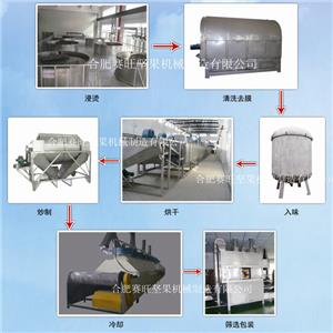 白瓜子(茶瓜子)生产线是有煮锅、吊篮、脱皮机、入味锅、单层干燥机、炒锅、冷却机、筛选、包装机等组成。生产流程是:原料浸烫→清洗去膜→烘干→炒制→冷却→筛选→包装。