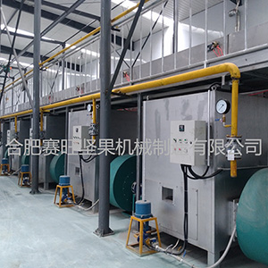山核桃、碧根果生产线工艺流程如下:自动杀青→焖料入味→输送→特制的双层翻版烘干机→冷却出料。